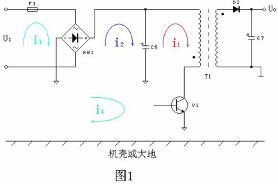 图1中,当电源开关管V1导通或者关断时,在电容器C5、变压器T1的初级和电源开关管V1组成的电路中会产生脉动直流i1,如果把此电流回路看成是一个“变压器”的“初级线圈”,由于电流i1的变化速率很高,它在“初级线圈”中产生的电磁感应,也会对周围电路产生电磁感应,我们可以把周围电路都看成是同一“变压器”的多个“次级线圈”,同时变压器T1的漏感也同样对各个“次级线圈”产生感应作用,因此电流i1通过电磁感应,在每个“次级线圈”中都会产生的感应电流,我们分别把它们记为i2、i3、i4 •••。